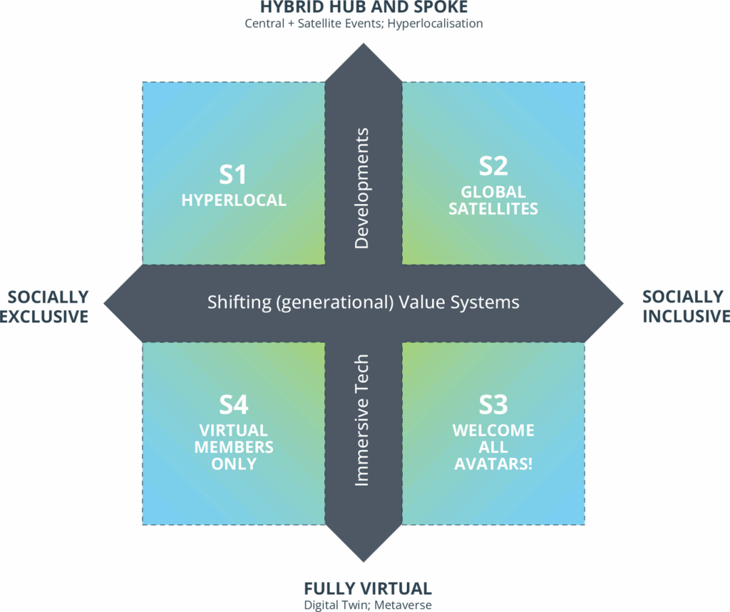 « À partir de ce travail, 4 scénarios extrêmes ont été développés. Ils décrivent et imaginent à quoi pourraient ressembler le secteur de l’événementiel professionnel et son environnement externe en 2035. Les axes de la croix de scénarios (voir figure ci-dessous) ont été déterminés par les facteurs de changement les plus incertains et les plus impactants. »