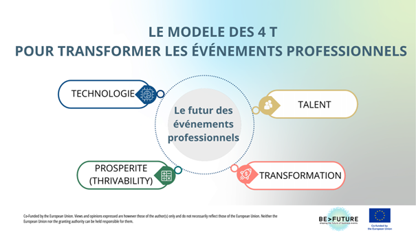Ces enseignements, tirés du processus de planification des scénarios, ont directement inspiré le livre blanc “New Scenarios and Business Models for the Future of Business Events”. Ce document clé a non seulement approfondi l’analyse, mais l’a également reliée aux principaux axes de travail nécessaires à l’innovation et à la résilience du secteur. En est né le modèle des 4 T : Technologie, Prospérité, Talent et Transformation.